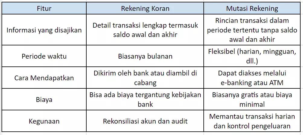 Meskipun terlihat mirip, namun rekening koran dan mutasi rekening memiliki beberapa perbandingan, yaitu: