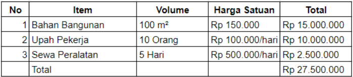 | 1 | Bahan Bangunan | 100 m² | Rp 150.000 | Rp 15.000.000 |