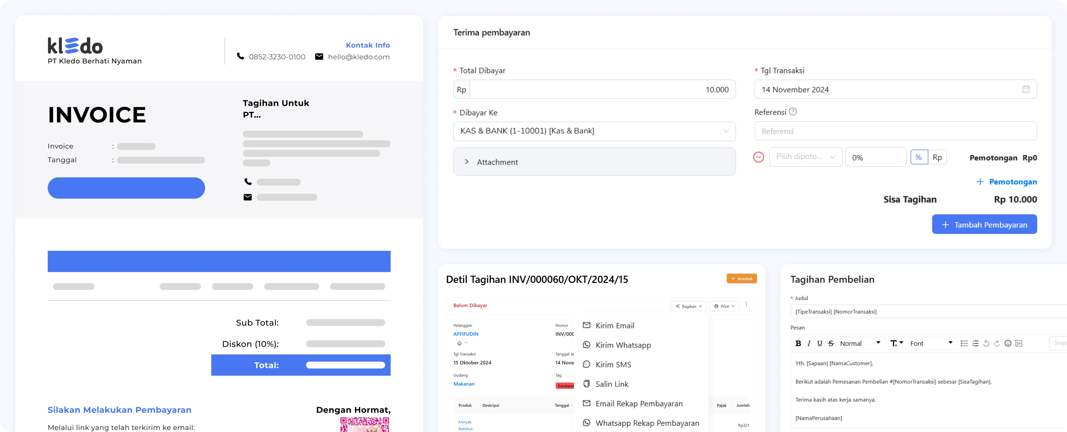 | Kledo | Fitur akuntansi lengkap, berbagai template invoice gratis, cocok untuk UMKM | Fitur terbatas pada paket gratis | Versi gratis tersedia, paket berbayar mulai Rp149.000 per bulan |